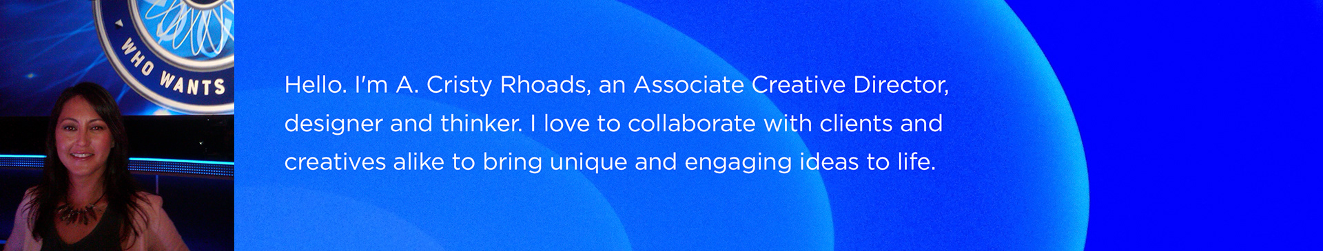“Cristy is one of those rare talents who is like a chameleon—she can be whoever you need her to be. Need a crack designer for a project with an impossible deadline? No problem. Need inspired creative ideas today for a client presentation tomorrow? Cristy will make sure it happens. For example, I hired her as a Senior Art Director. But when the CD on a very large and important pharma account left, Cristy not only stepped in on this very demanding account, she did it with grace, humor and the utmost professionalism. Bring her in for a freelance assignment and soon you’ll be looking for ways to bring her on full-time. She’s that good. ”