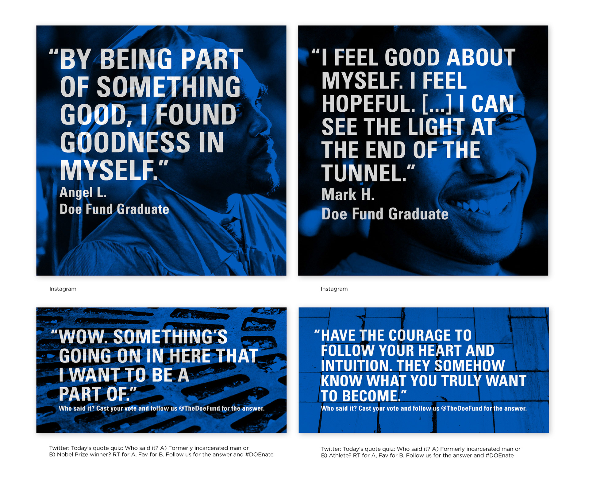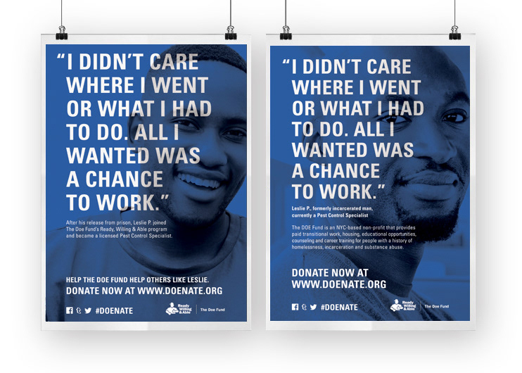 The ask: Grow the donor base, particularly among millennials. We developed a campaign that highlights the unexpected commonalities between prospective donors and Doe Fund participants, who were all previously incarcerated. Via social media, we are generating opportunities for personal connections that lower the threshold to donate and elicit immediate responses.