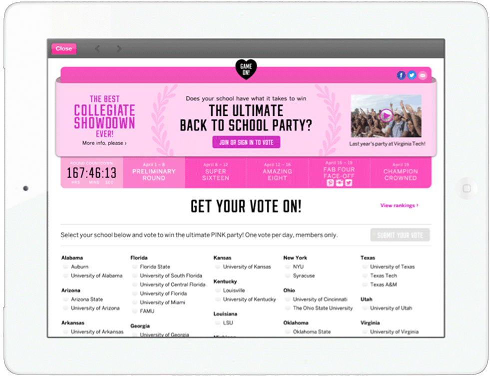 PINK girls are on the go. We developed a mobile game for the Victoria's Secret sub-brand of PINK, as well as a social promotion whereby our audience could win a back-to-school party promoted by PINK.